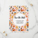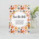 Save the date card with a seasonal fall pattern, Corn, mushrooms and flora. Along with turkeys and scarecrows to honour the Thanksgiving tradition.