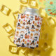 Can coolers with a seasonal Thanksgiving pattern. Featuring whimsical pilgrims, turkeys, pumpkin pie and other various autumn themed elements.