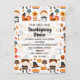 Invitation postcard with a seasonal Thanksgiving pattern. Featuring whimsical pilgrims, turkeys, pumpkin pie and other various autumn themed elements.