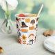 Paper cups with a seasonal Thanksgiving pattern. Featuring whimsical pilgrims, turkeys, pumpkin pie and other various autumn themed elements.