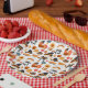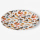 Paper plates with a seasonal Thanksgiving pattern. Featuring whimsical pilgrims, turkeys, pumpkin pie and other various autumn themed elements.