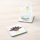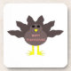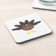 This awesome cork coaster features a cartoon of a turkey with big black eyes, a small yellow beak and tail feathers sticking up. The feet are facing in opposite directions making the turkey look goofy. The turkey has pink text on its’ belly that says “Happy Thanksgiving” and it looks like the feathers have been plucked out to reveal the message.
