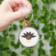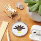 This cute keychain features a cartoon of a turkey with big black eyes, a small yellow beak and tail feathers sticking up. The feet are facing in opposite directions making the turkey look goofy. The turkey has pink text on its’ belly that says “Happy Thanksgiving” and it looks like the feathers have been plucked out to reveal the message.
