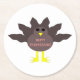 This awesome paper coaster features a cartoon of a turkey with big black eyes, a small yellow beak and tail feathers sticking up. The feet are facing in opposite directions making the turkey look goofy. The turkey has pink text on its’ belly that says “Happy Thanksgiving” and it looks like the feathers have been plucked out to reveal the message.
