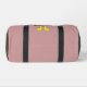 This awesome gym bag features a cartoon of a turkey with big black eyes, a small yellow beak and tail feathers sticking up. The feet are facing in opposite directions making the turkey look goofy. The turkey has pink text on its’ belly that says “Happy Thanksgiving” and it looks like the feathers have been plucked out to reveal the message.