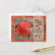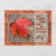 This bright orange and red fallen leaf signals the onset of autumn, the harvest season and the approach of Thanksgiving. The front photograph features warm earthtones and the back message reads simply "Happy Thanksgiving".