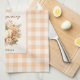 Thanksgiving kitchen towel in elegant modern farmhouse style, featuring floral pumpkins and gingham in soft orange, cream, and green on the cream background. Easily personalise the text. - Kate Eden Art