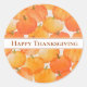 This small round sticker is shown with a festive Thanksgiving pumpkin watercolor print.