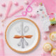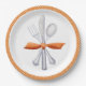 These paper plates have a watercolor painting of silverware tied with an orange bow. There is an orange and white polka dot border on a white background. Colours used include orange, grey and white.