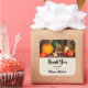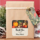 Event thank you stickers with a photograph of a thanksgiving harvest, set on a rustic wooden table. Pumpkin, potatoes, squash etc... make up this bountiful collection of food. Colourful autumn leaves surround the cornucopia basket.