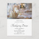 THanksgiving invitation with a beautiful classy photograph. A Thanksgiving holiday table featuring fine china and glassware. Fancy golden bokeh lights in the background. A single off white gourd sits on top a plate.