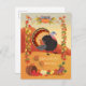 A colourful turkey bird displays its plume. Fall leaves and a bountiful harvest adorn the scene.