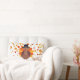 This throw pillow is shown with a autumn fall leaves and a Thanksgiving turkey print on a white colour background.