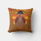 This throw pillow is shown with a autumn fall leaves and a Thanksgiving turkey print on a light brown colour background.