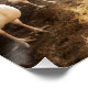 A group of turkeys is gathered in a sunlit wooden barn with one turkey holding a sign that reads "Eat Pork."