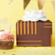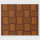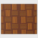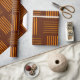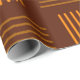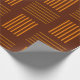This wrapping paper has a mid-century modern design that looks like a weave with orange and brown lines on a field of darker brown.