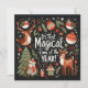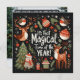 An adorable Christmas-themed design featuring cute woodland animals—cute bears and festive birds—dressed in cosy winter scarves and surrounded by holiday presents. The soft colour palette of red, white, and grey, paired with decorated Christmas trees, stars, and delicate floral elements, brings a Scandinavian-inspired charm. The "It's that Magical time of the year" message completes this heartwarming, whimsical holiday scene, perfect for cards and seasonal decor.