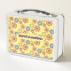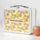 This fun design is made up of colourful flowers set on a yellow background. Lunchboxes are available in 7 colours, including stainless. The text can be customised.
