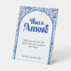 The “That’s Amore” Italian Retro Typography Tabletop Pedestal Sign features a bold blue Mediterranean tile border inspired by classic Italian ceramics. The detailed floral pattern frames a clean white arched center, creating a refined and balanced presentation. The rich cobalt blue tones give the sign a timeless European look.