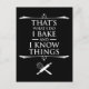 That's What I Do - I Bake And I Know Things. This funny quote baking accessory is a great gift for a man, woman, teens & kids who love to bake in the kitchen. Also perfect for a baker or a bakery worker. If you're a home baker, love the culinary arts, and love to prepare delicious bread, muffins, cakes or cupcakes in the oven, then this humourous design is for you.