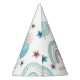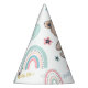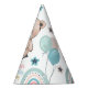 The 1st Birthday Party Hat is decorated with a cute teddy bear, balloons and a rainbow.