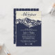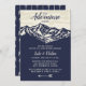 The Adventure Begins Mountain Rustic Baby Shower Invitation in Midnight Blue, Arrow Pattern on Reverse Side.
