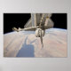 The aft section of the docked space shuttle Discovery and the station's robotic Canadarm2 featured with STS-131.