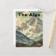 Escape to the mountains with this classic 'The Alps' Vintage Travel print. This Mid-Century Modern illustration captures a majestic, snow-capped peak rising above a valley, complete with a cozy ski lodge cabin nestled among the pine trees.