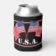The black background ha a red and white border at the top and bottom of the design. In the centre there are two American flags and at the bottom are the letter U.S.A., in a stencil type font.
