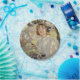 This design features a painting by the Scottish artist Bessie MacNicol (1869–1904), who was associated with the Glasgow School of art. It depicts a young woman in a white dress as she sits gracefully beneath the boughs of an apple tree. She is holding a bouquet of flowers in her left hand and a lady's mirror in her right hand. Her hair is chestnut brown and it falls down to the nape of her neck; she has some flowers in her hair too. She is smiling at the viewer with a simple and carefree joy. The leaves of the apple tree are green behind her. It is a bright summer's day and she appears to be sitting on the grass. The original artwork was painted by Bessie MacNicol in 1899.