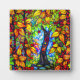 Colourful tabletop art created with AI software features a surreal stained glass apple tree with green and gold leaves, and red apples, that create a frame as well.