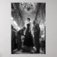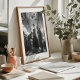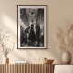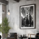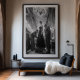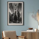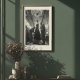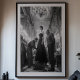 This powerful black and white photograph captures a timeless, behind-the-scenes moment from the golden age of haute couture. From a dramatic low angle, the viewer is drawn into an opulent Parisian salon where a master couturier and his assistant perform a meticulous fitting on a model. She stands with quiet grace in an elegant black gown, a living embodiment of the art being created around her. The scene, illuminated by glittering crystal chandeliers, is a stunning tribute to the dedication, craftsmanship, and enduring glamour of high fashion. This piece is perfect for lovers of classic photography, design history, and sophisticated, statement-making art.