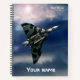 This notebook features a photo of the Avro Vulcan Delta Wing Strategic Bomber flying against a dramatically lit sky. The bomb bay is open. You can personalise it with your name.