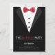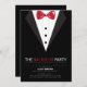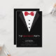 Invite them to the bachelor party with this elegant and stylish invitation featuring a black tuxedo and red bow tie.