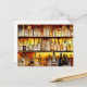 Postcard featuring an artistic depiction of liquor and spirits bottles arranged on shelves for the back bar of an establishment. Digital watercolor created using AI generating software.