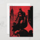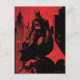 Comic book style illustration of Batman standing atop a gargoyle in Gotham City.