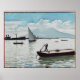 Among European cities Marquet remained impressed particularly with Naples and Venice where he painted the sea and boats, accenting the light over water. He adopted a technique nothing like the Impressionists', painting water as a large area of simple tone which held the plane of the water surface without illusionistic perspective, from which the ships arise into a different plane. His views of the lagoon in Venice do this very economically. The water stays at a right angle to the picture plane and the large ships float with ease, with their reflections exactly the correct tone to project the required space. His colour is much like Matisse of the 1920s, here. His contrasts of vivid colours describe the waves of the sea with simple drawing which accompany the exactly observed colour tones, giving a scene of placid movement. The human figures are much simplified, calligraphically drawn in a way related to Japanese Shijo style work. Matisse is said to have called him "ourHokusai".