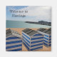 A fridge magnet showing a stylized picture of a group of beach huts at the Hastings beach.
