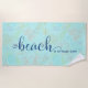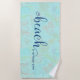 Beach towel with "The Beach is My Happy Place" in a modern typography style with subtle background of turtle, fish etc.