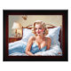The Bed Is Just Fine AI Concept Art by Xzendor7; states the smiling blonde pin up girl as she reclines on it. Read The Short Story At My Website: https://xzendor7.com/the-bed-is-just-fine-by-xzendor7/