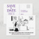 Funny vintage save the date card, black and white illustration with funny text.