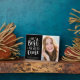 This fun graduation design features hand lettered text, gold fireworks and stars against a bold black background.