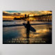 A young surfer holds his board and is silhouetted against the sunset and the Oceanside Pier. Oceanside is 40 miles North of San Diego, California. The following fun quote near the bottom says "The best surfer out there is the one having the most fun"