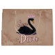 The black swan, queen of the water. The swan is adorned with a delicate pink crown that underlines its regal appearance and adds a touch of sophistication. The water in which the swan sits is represented by a subtle ripple effect that conveys movement and vibrancy without disrupting the serene elegance of the motif. The lettering "Swan Diva" is designed in a decorative, playful font that harmoniously complements the overall image.