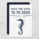 Designed to match our Seahorse & starfish wedding invitations and accessories this nautical chic wedding save the date features a vintage style hand drawn Seahorse illustration in navy blue.