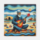 A.I. created print of a bearded man wearing a hat sits cross-legged on a colourful mat, playing a Bouzouki stringed instrument by a surreal beach with vibrant, swirling patterns. The landscape features unusual rock formations, a bright sun, and a calm sea.