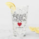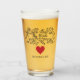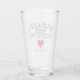 A wedding reception glass for beer with the text, The Bride. A ribbon banner with flowers and leaves, along with a red heart. Customise with your wedding date.