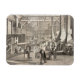Vintage print showing a view of the building interior of H.C. Redington & Company, a grain and grass scythe manufacturer located in Littleton, New Hampshire. Blacksmiths, furnaces, and other machinery visible throughout space. Two children watch a pair of men working at an anvil in foreground.