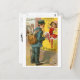 Funny, vintage illustration of a letter carrier (mailman) with a bag of mail to deliver, but at the moment is too wrapped up in an eye catching advertisement of a theatre dancer.
