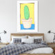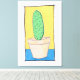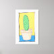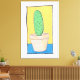 This stretched canvas has a compnaive art composition of a single lobed cactus in a flower pot. The background is yellow and blue, the pot is pinky beige and the cactus is very green and spiky, all contained within a thin black border, with a white surround. The artwork is hand drawn using watercolours, pen and ink. It is unique to The Art of Being Beth at Zazzle.